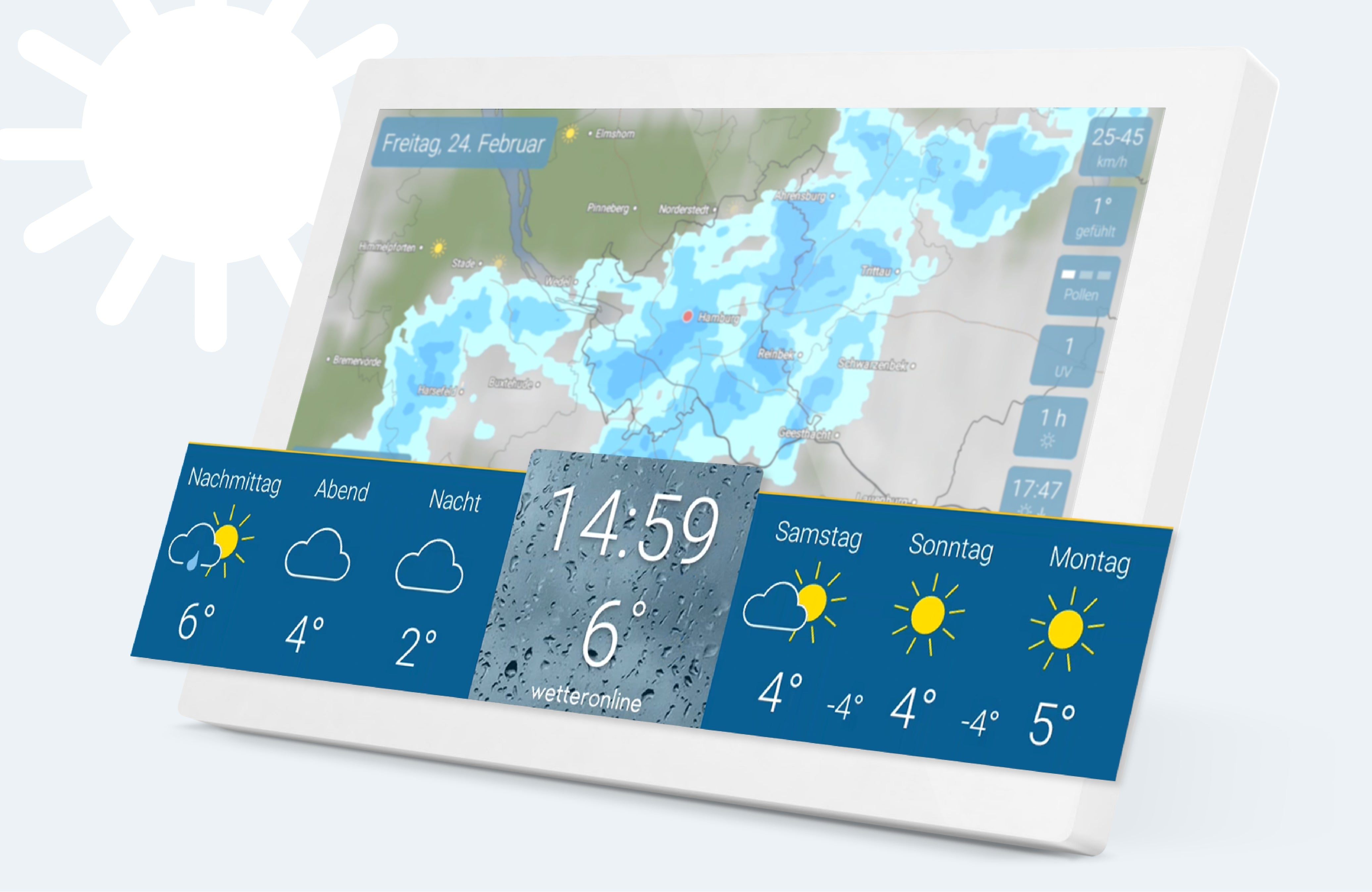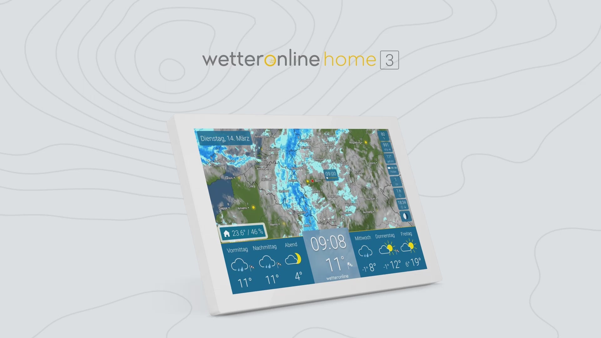 Sie nehmen wetteronline home 3 in Betrieb, indem Sie das Gerät an den Strom anschließen. Danach leitet Sie das Programm schrittweise durch die Einrichtung. Nach der automatischen Standortermittlung wird sofort das Wetter für Ihren Ort angezeigt. Wählen Sie aus einer von 15 Sprachen, in denen Ihnen wetteronline home 3 das Wetter präsentiert: Deutsch, Englisch, Französisch, Niederländisch, Dänisch, Spanisch, Italienisch, Portugiesisch, Polnisch, Tschechisch, Slowakisch, Slowenisch, Ungarisch, Rumänisch und Bulgarisch.