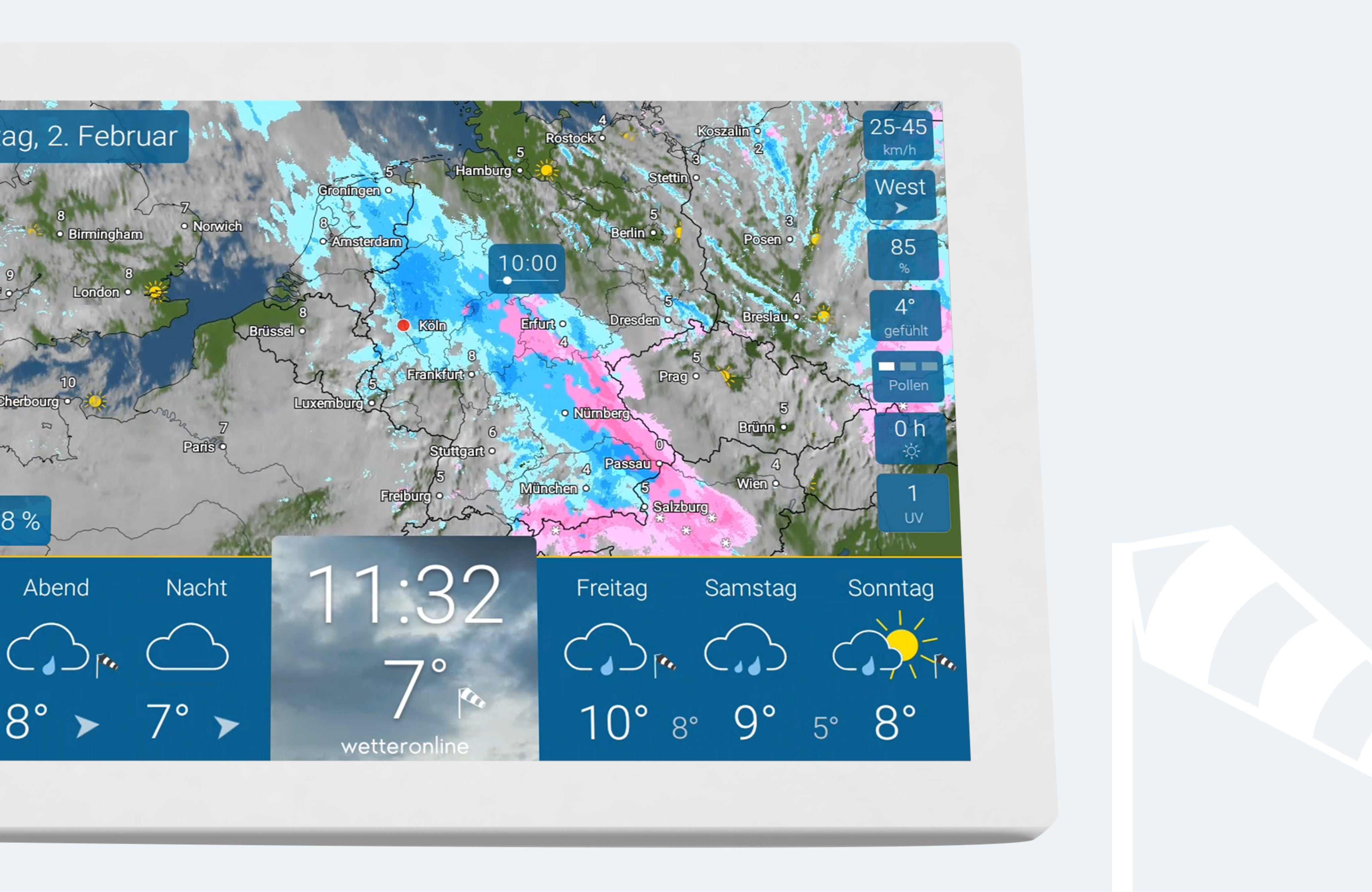 Sie nehmen wetteronline home 3 in Betrieb, indem Sie das Gerät an den Strom anschließen. Danach leitet Sie das Programm schrittweise durch die Einrichtung. Nach der automatischen Standortermittlung wird sofort das Wetter für Ihren Ort angezeigt. Wählen Sie aus einer von 15 Sprachen, in denen Ihnen wetteronline home 3 das Wetter präsentiert: Deutsch, Englisch, Französisch, Niederländisch, Dänisch, Spanisch, Italienisch, Portugiesisch, Polnisch, Tschechisch, Slowakisch, Slowenisch, Ungarisch, Rumänisch und Bulgarisch.
