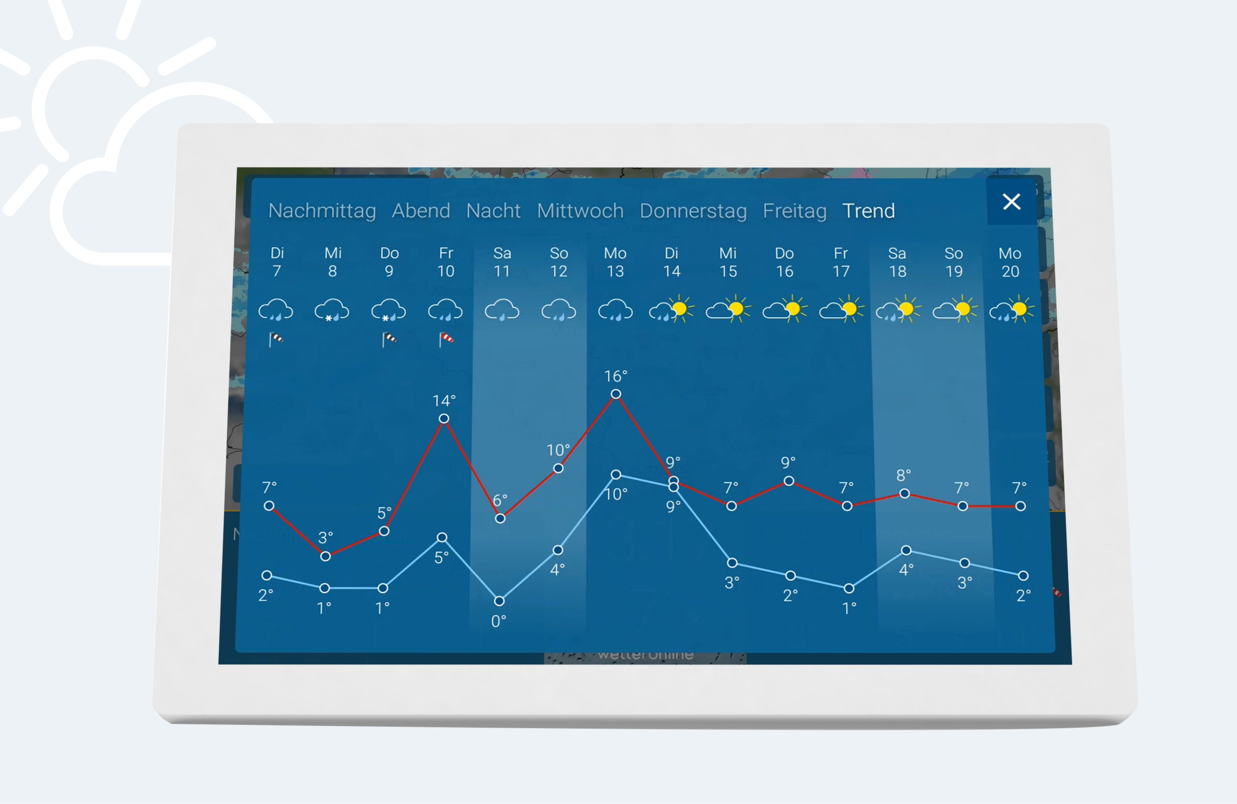 Der untere Bildschirmbereich zeigt Ihnen übersichtlich und klar gegliedert links das Wetter im Tagesverlauf und rechts den WetterTrend der kommenden Tage.