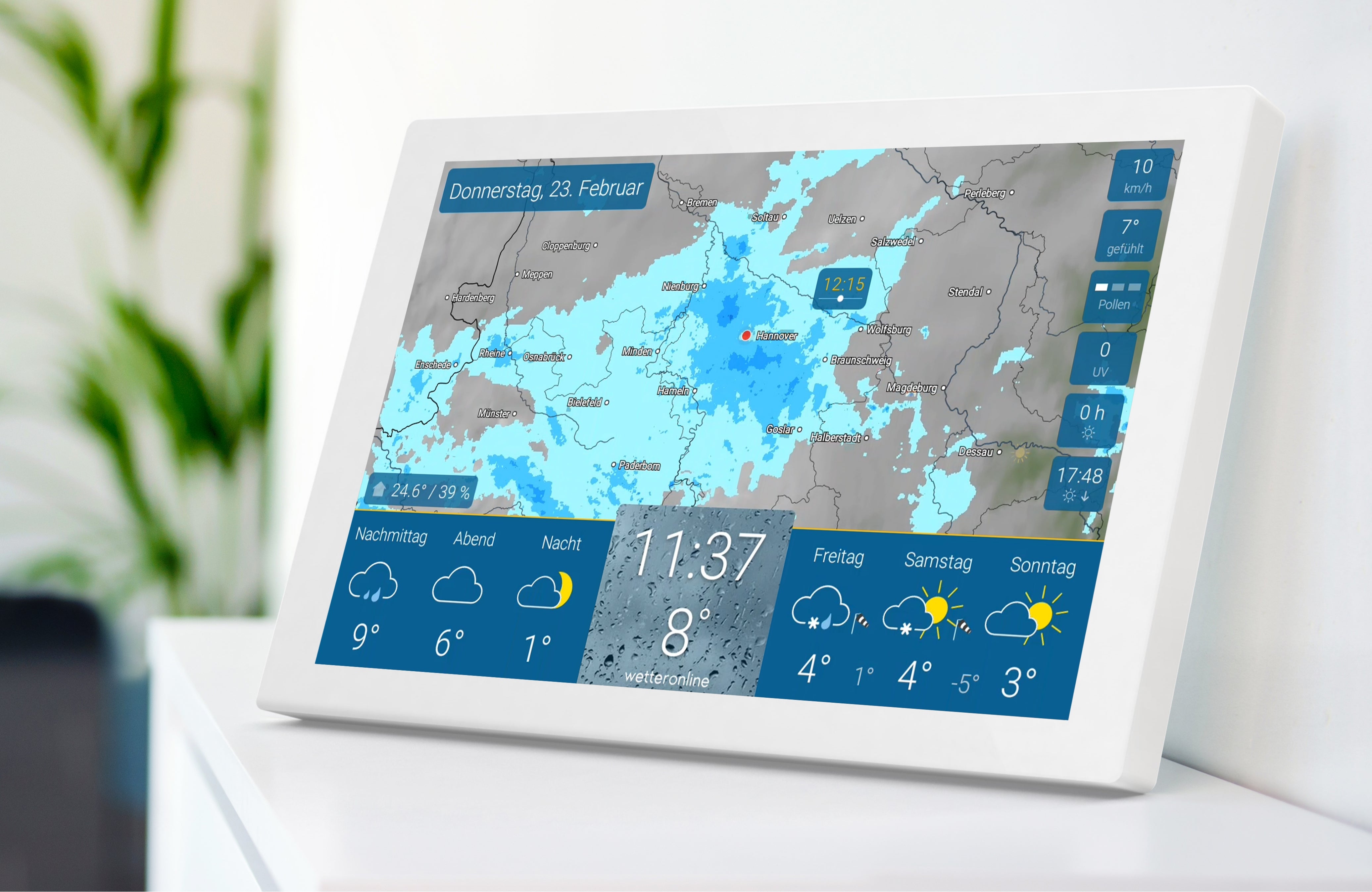 Das Gerät zeigt in einer übersichtlichen Darstellung Informationen zum aktuellen Wetter für einen weltweit per Ortung ermittelten Ort auf einem blickwinkelstabilen HD-Display an. Mit dem WetterRadar verfolgen Sie das Wetter live für die nächsten 90 Minuten. Zoomen Sie nah heran für mehr Details oder weiter heraus, um die künftige Wetterentwicklung einschätzen zu können. Der WetterTrend zeigt die Wettervorhersage für heute und die nächsten Tage. Die Wetterstation warnt vor Unwettern. Auch ergänzende Wetterinformationen können Sie nach Wunsch einblenden.