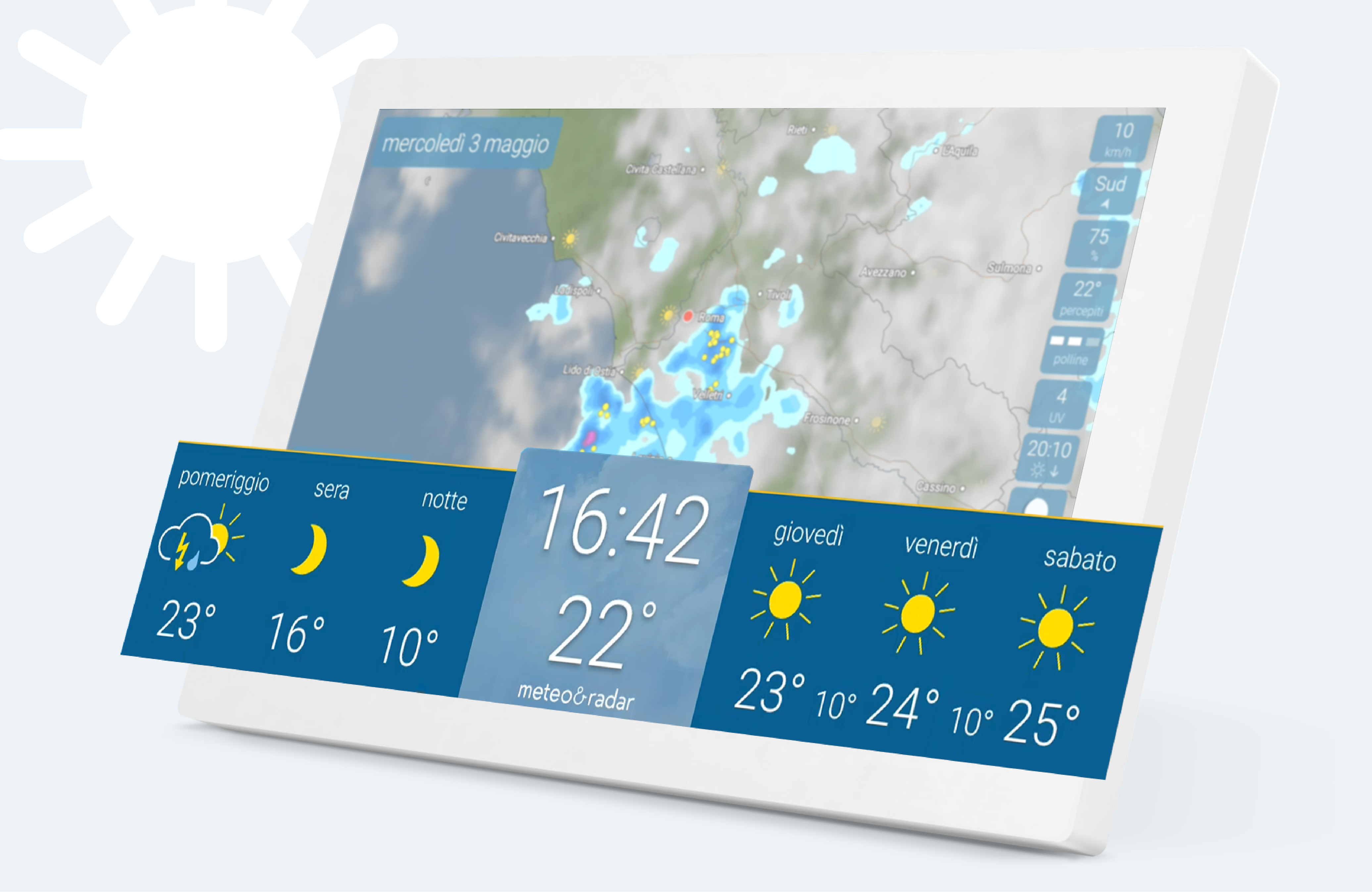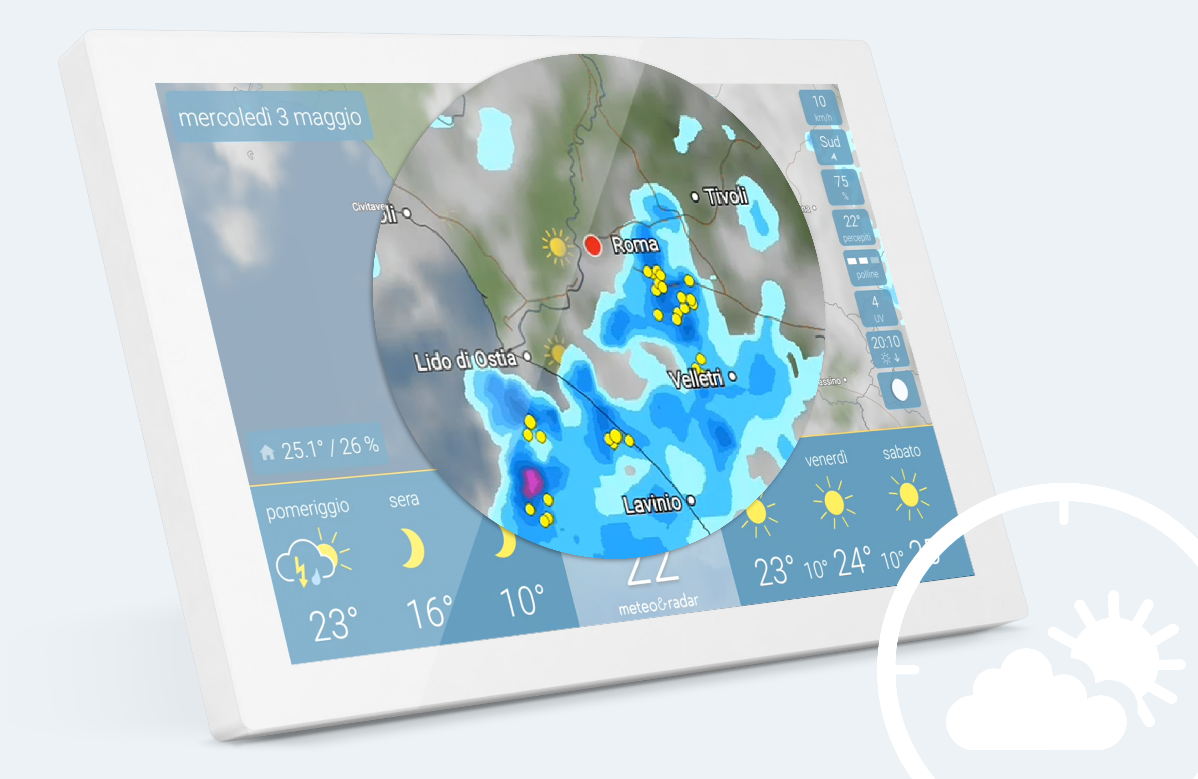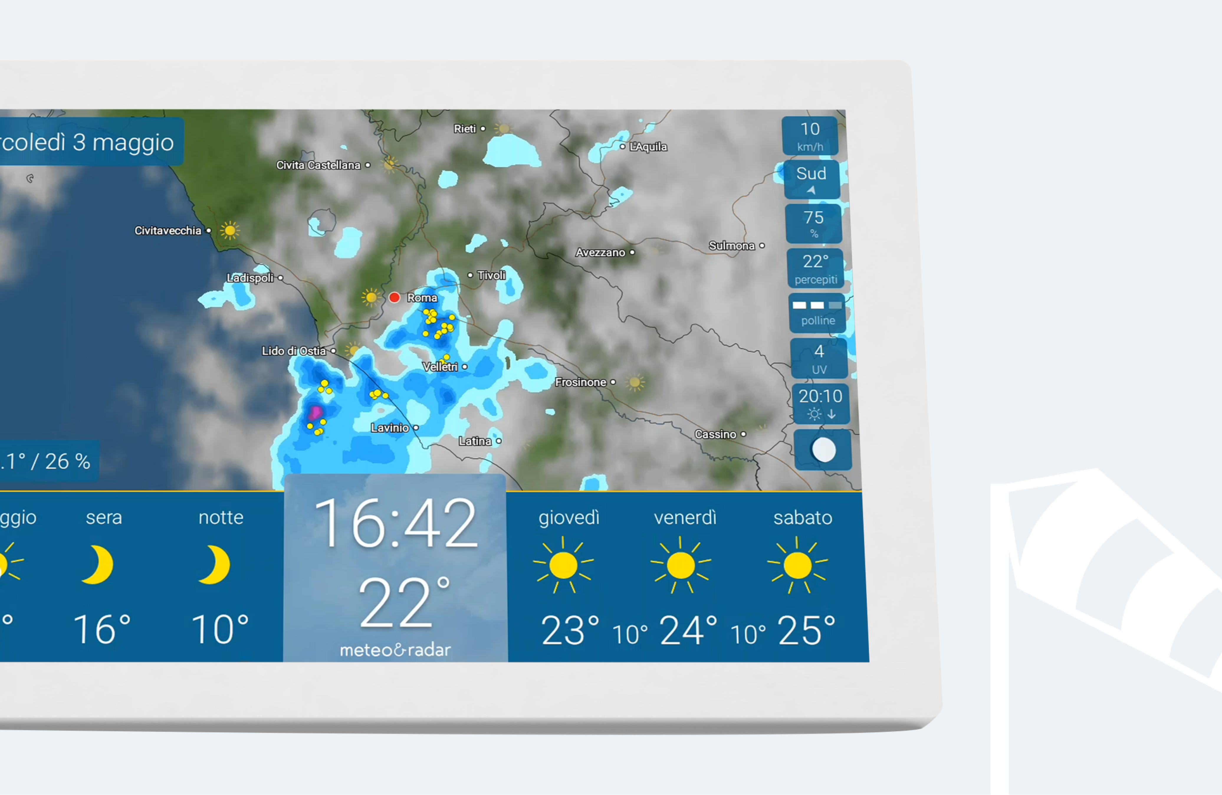 In una modalità del tutto immediata e comoda avrai il meteo in diretta: con il Radar meteo e la rappresentazione grafica delle condizioni meteorologiche nella tua località e per i prossimi 90 minuti. Con un semplice clic l’innovativo display meteo mostrerà un’animazione dei fenomeni meteorologici, con l’evoluzione del tempo per la prossima ora e mezza.