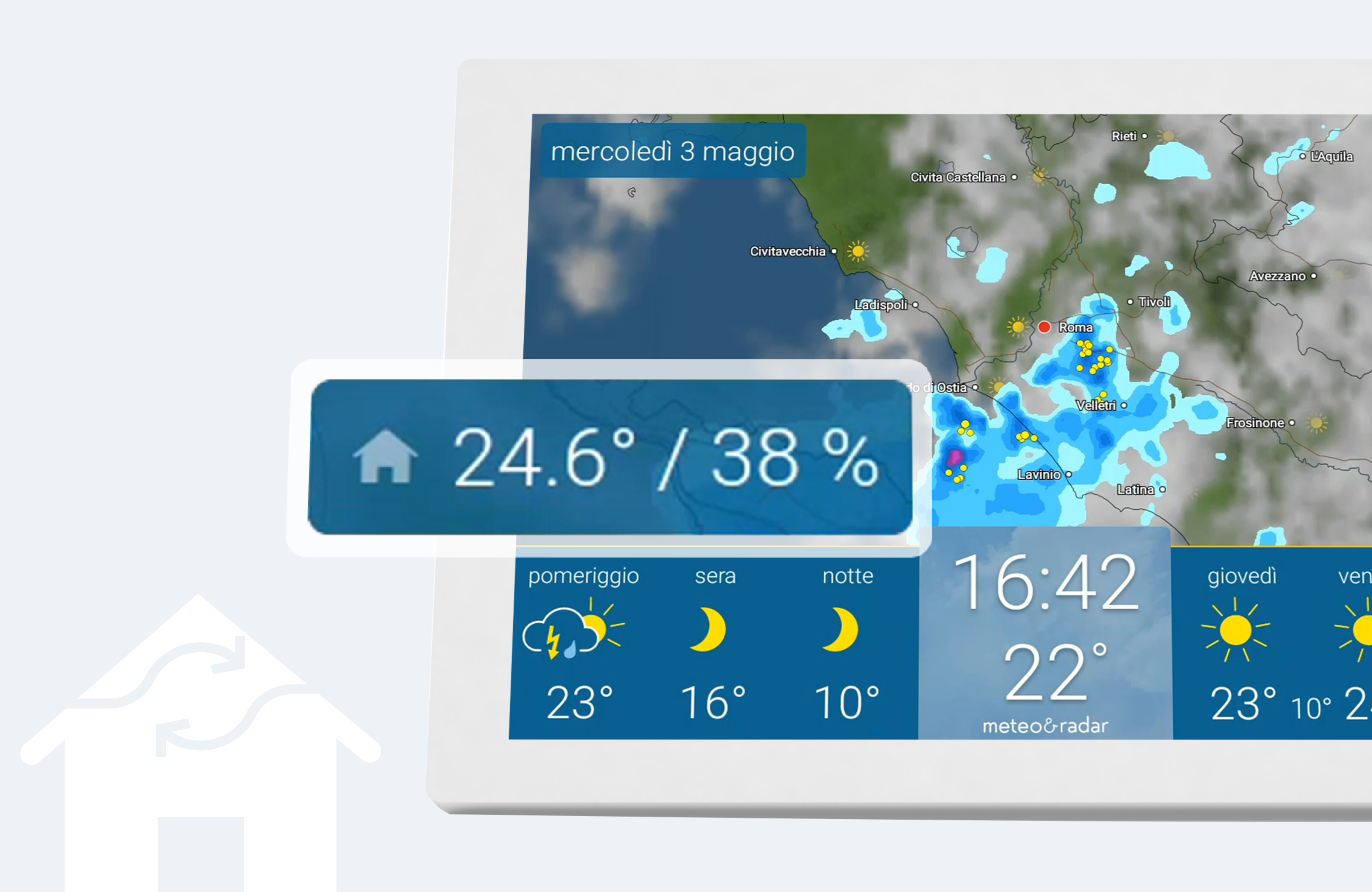 Un sensore integrato alla stazione misura la temperatura e l'umidità degli ambienti interni. Con meteo & radar home 3 sarà molto più facile controllare il clima di casa, uffici, ecc. e regolare la temperatura in modo efficiente.