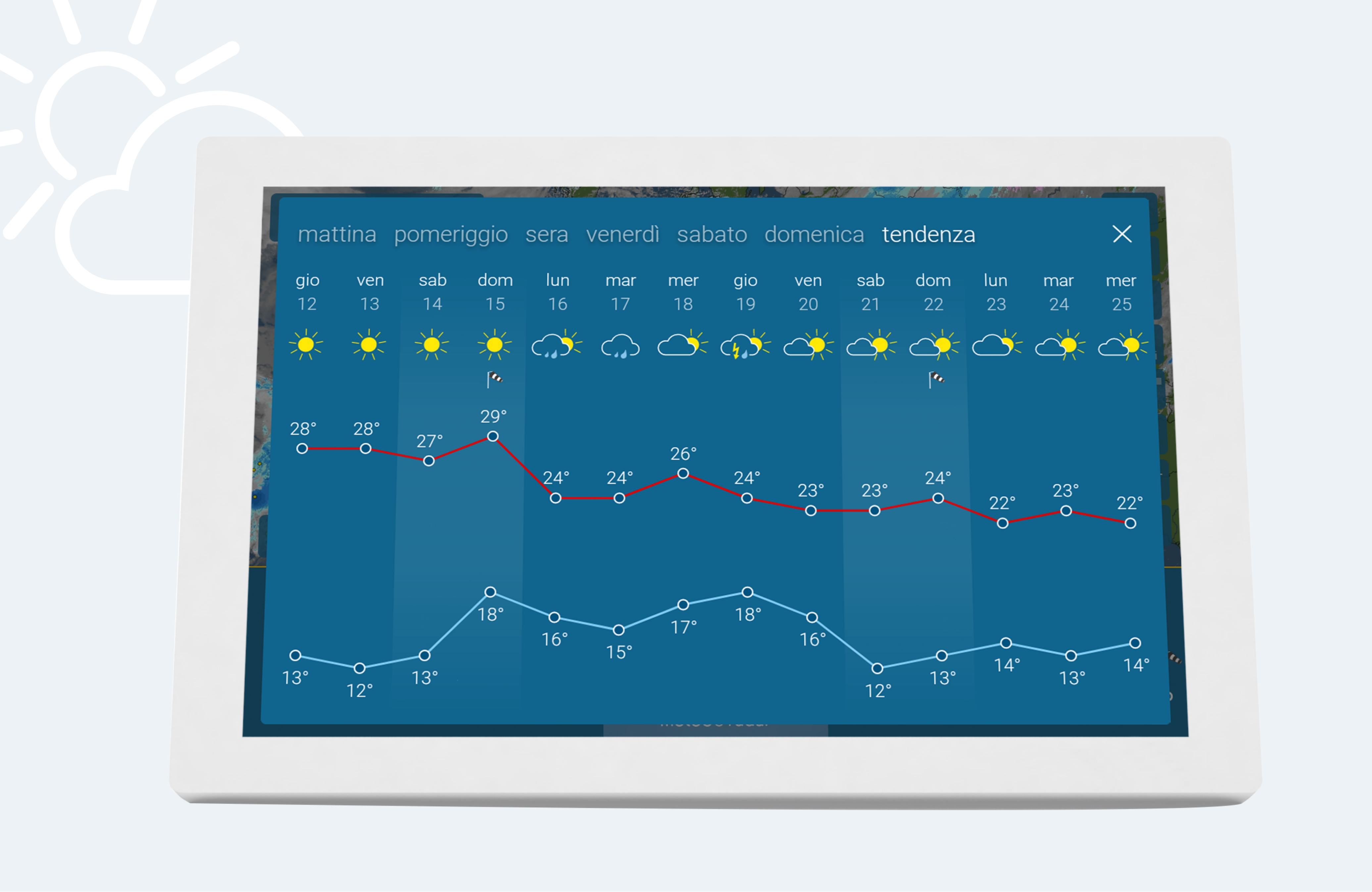 La parte inferiore dello schermo mostra in modo chiaro e semplice il meteo giornaliero a sinistra e la tendenza meteo per i prossimi giorni a destra. Al centro vengono visualizzati l'orario e la temperatura attuale.